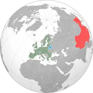 The geographical position of the China–Belarus Industrial Park (brown dot in the middle). EU is shown in green, China in red