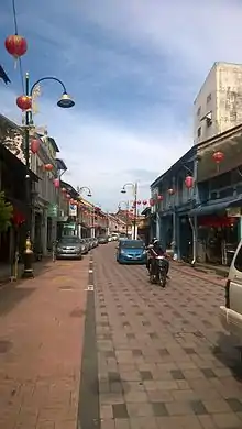 Kampung Cina (Jawi: کامڤوڠ چينا; Chinese: 唐人坡; Pe̍h-ōe-jī: Tn̂g-lâng-pho), is a Chinatown located in Kuala Terengganu, Terengganu, Malaysia. Kampung Cina is located along Jalan Bandar (formerly known as Jalan Kampung Cina), in Kuala Terengganu city centre at the river mouth of Terengganu River that empties into the South China Sea. Kampung Cina literally means Chinese Village; it is also called Tn̂g-lâng-pho (唐人坡) or KT's Chinatown by local people. It is one of Southeast Asia's early Chinese settlements and contains stately ancestral homes, temples, townhouses, and business establishments. The town is small but has colourful shophouses along both sides of the road that carries traditional flavour.