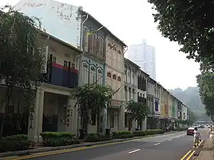 The shophouses were home to "death houses" until 1961, when death houses were banned,[3] and brothels[4] until 1930, when the Women and Girl's Protection Ordinance was enacted, bringing the prostitution situation under control.[5] To cater to those who visited brothels, or participated in extended affairs of Chinese funerals[6] or came to frequent the opera theatre,[7] street hawkers, food stalls and traders selling household goods occupied the streets. In order to address overcrowding and poor living conditions in the city,[8] all street hawkers were relocated into the newly built Kreta Ayer Complex in 1983, which is today's Chinatown Complex.