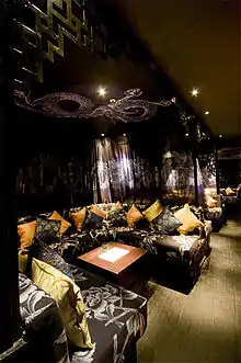 The original club in Soho had a number of "suites" with soft, bed-like lounging areas. including a "VIP suite" which gained notoriety in the British press over the years.[11] The Unofficial Guide to London described the club as "highly artistic and colourful", and noted the "oriental styles and Chinese daybeds mixed with theatrical flair [and] unique lighting and cushions everywhere".[12]