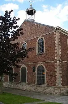The chapel dates from 1721 on land donated by Nathan Mort of neighbouring Alder House[7] It is built in rustic brick, in Flemish bond on a rubble sandstone plinth, with stone quoins, an eaves cornice and a slate roof. The side elevations have three bays and the rear four bays, both have round-arched windows. On the roof is a small cupola housing a single bell. A two-storey extension was added on the south side in 1901. Its facade has a gable pediment with an oculus within the tympanum. There is a fanlight above the double doors with a sundial above and a commemorative plaque above that.[2]