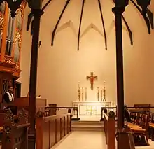 Although the original color of the interior walls is unknown, the beamed ceiling was originally painted light blue. Two panels above the altar included text from "Sanctus." Central pews entered from the sides, but a middle aisle was added later. The church's choir loft was illuminated with leaded-glass windows to the north of the chancel.[25][26]