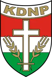 The Christian Democratic People's Party (Hungarian: Kereszténydemokrata Néppárt, KDNP) is a right-wing Christian democratic[3][7] political party in Hungary. It is officially a coalition partner of the ruling party, Fidesz, but is mostly considered a satellite party of Fidesz.[8][9] The party has been unable to get into the Parliament on its own since the 1990s (with the last time it did so being 1994), as it was not able to pass the election threshold of 5% of the vote. Without Fidesz, its support is now low enough that it can no longer be measured,[10][11][12] and even a leading Fidesz politician, János Lázár, stated that Fidesz does not consider the government to be a coalition government.[13]