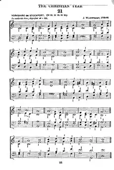 The association with the tune "Yorkshire" (sometimes also "Stockport") is an early one: some accounts describe it being sung under the direction of its composer by a group of local men and boys for Christmas 1750, some time after the writing of the poem;[5] although it is not possible to tell how the poem was originally divided along to the tune. The first edition that has it in combination with Byrom's text is in Wainwright's only known musical publication, undated but assumed from newspaper announcements to have been published in 1766.[3][6][lower-alpha 3]