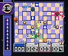 ChuChu Rocket! is an action puzzle game.[1] The basic rules of the game require the player to guide mice, dubbed "ChuChus", into a rocket while evading them from dangerous cats, dubbed "KapuKapus".[2]:8–9 A brief premise is provided in the instruction manual, explaining that ChuChus are living on a space port that is invaded by KapuKapus one day. In their frantic state, the ChuChus begin running around in chaos, and so the player must guide them to their rockets to save them.[2]:2–5 Both ChuChus and KapuKapus run in a straight line, and turn right when they hit walls. A player can place up, down, left, and right arrows on the field of play, redirecting characters that step on them. Up to three arrows can be placed by a player at any time; placing a fourth arrow will make the player's oldest arrow vanish, and all arrows fade away over time. If a KapuKapu hits an arrow twice, the arrow disappears.[2]:6–9