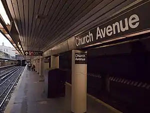 The Church Avenue station is an express station on the BMT Brighton Line of the New York City Subway, located at Church Avenue near East 18th Street in the Flatbush neighborhood of Brooklyn. The station is served by the Q train at all times and by the B train on weekdays only.