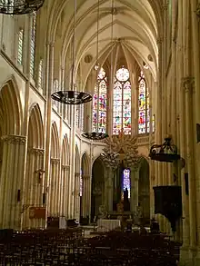 The Church was registered in 1862 into Monuments historiques.[3] It is a remarkable example of a Gothic church from the School of Champagne, or Île de France. Some of the stained glass windows are from the 13th century (north side)[4] and others from the 16th century (The Life of the Virgin, south side, 1st chapel). You can notice one of the first examples in a stained glass of a figure with spectacles. This window depicting the Last Judgement is due to Jean Cousin the Younger. The statue of the Virgin with a Bird (14th century)[5] is from a royal manufacturer (right side). A Madonna with the Child is a polychromatic statue from the 16th century (left side). Other interesting elements are paintings such as The Adoration of the Shepherds (around 1780) from François-Guillaume Ménageot,[6] an Immaculate Conception and a portrait of saint Louis worshipping the Crown of thorns.[7]
