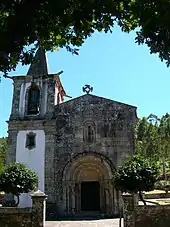 The principal facade, complete with gable, includes an archway portico comprising four archivolts, three of which are mounted on column capitols with alternating vegetal and zoomorphic designs.[3] An important part of the church is this axial portico, which represents theAnnunciation.[2] The central columns include sculpted forms; on the left is a representation of an angel with long hair, beard and parchment (likely the Angel Gabriel), while the right form is the Virign with veil and raised hands.[3][4] Although these forms are not well defined, they testament to the popularity of public interests at the time of its carving, providing an iconographic representation of the scene rather than a clearly literal interpretation.[2] These sculptural themes are comparable to the churches of Sanfins de Friestas, Longos Vales and Bravães and suggest its completion in the middle of the 13th century.[2][3] The lintel is inscribed with the presumed date of its construction, while in the tympanum is the figure of Christ surrounded by aureola.[2] The representation of Christ is part of the first revivalist reproduction of the tympanum, while the serpentine lintel which is thin and less profound, is almost graffiti and less to do with the original form.[2][3] The tympanum although "a bad reconstitution, relatively modern, of the older piece"[5] is part of the a restrictive number of representations of the Christ in aureola for the period, and is here treated summarily with de-contextualized flowers flanking the aureola. Even by the 1980s, there still existed fragments of the original tympanum in the area that confirmed that a copy was installed in the portal.[6] Carlos Alberto Ferreira de Almeida dated the epigraph to 1257, although it seems late given the architectural elements of the Church, raising debate due to the difference stylistically in age of the elements.[2][3] Almeida interpreted later writings, and assumed a late Galician influence on the temple, which was later rebuked in favour of an earlier date.[3][6]