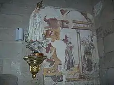 At the left of the altar, through a triumphal arch, is fresco painting consisting of monk and angel, in partial ruin, with fragments missing. The interior paintings, executed in fresco over a thin layer of plaster, was completed in a restricted colour palette: ocres, reds, black, blue and a mixture of the two.[2] Incisions were detected in the plaster, corresponding to the original design that was applied to the wall, although there are no indications of junctions between the plaster.[2]