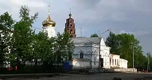 The wooden church of St. Nicetas is known to have existed in 1511.[1] It was rebuilt in stone in 1647 but remained one of the town's poorest churches through much of its history. Its main treasure was the large 16th-century icon of St. Nicetas, currently on exhibit in a local art gallery. After the Russian Revolution the church was closed and dismantled. Some of the frescoes were taken down to be sold abroad.[1] Its remarkable bell tower, built at some point during Peter the Great's reign, still stands.[2] The Soviets classed it as an object of top military importance because of its considerable height.