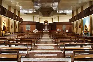 The plan of the church is in the shape of a Latin cross with the arms widening in a trapezoid shape toward the center of the transept, where the main altar, made of light marble, is located. It has a single large nave, with plastered and painted masonry and whose floor is made of light Versilia marble with dark red marble squares;[3] this is characterized by the rhythm of reinforced concrete pillars, painted mustard-colored, at the top of which they are connected through trusses. Surrounding the chancel are the sacristy and penitentiary. In the upper part of the masonry is housed a band of wood-effect coated reinforced concrete, which runs around the entire perimeter of the liturgical hall. On this band are paintings depicting the Stations of the Cross, made by the painter Compagnone.[6] Lower down are placed, three on each wall, paintings dedicated to the life of St. Martin of Tours. On the right aisle is a chapel dedicated to Our Lady, while the left aisle houses statues of Saints Rita of Cascia, Anthony of Padua, Joseph and Padre Pio, as well as the urn of Blessed Carino of Balsamo. Above the entrance portal, in the upper part of the counter facade, is housed the sculpture of the Risen Christ. Several banners cover the walls.[19]