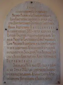 The Orthodox Church of St. Michael and St. Constantine (Lithuanian: Šv. Konstantino ir Michailo Cerkvė; Russian: Церковь Святых Константина и Михаила) is a Russian Orthodox church in Vilnius, Lithuania, belonging to the Russian Orthodox Diocese of Lithuania.. It was built in 1913 to commemorate the 300th anniversary of the Romanov dynasty.[1] It was built by I. Kolesnikov, and incorporates the Rostov and Suzdal architectural styles. On its consecration day of May 13, the church was visited by the former royal figure Grand-Duchess Elizabeth Feodorovna. She was known at the time of consecration as Sister Elizaveta and is now a martyr within the Russian Orthodox Church.