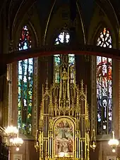 For the Franciscan Order in Poland the period of foreign partitions was deadly. By 1864, from over 90 Franciscan monasteries only 8 remained in the country including the one in Kraków.[3] The situation slightly improved after the Austro-Prussian War. In 1866, Austria granted a degree of autonomy to Kraków after its own massive defeat.[7] In 1895, the eastern part of the church received murals with floral motifs by the founder of Young Poland, Stanisław Wyspiański. Wyspiański was also the author of magnificent stained glass windows in the apse, manufactured at the Innsbruck foundry in 1899–1904. The re-consecration of the renovated church by Bishop of Kraków, Anatol Nowak, took place on 14 June 1908. It was promoted to the rank of Basilica Minor on 23 February 1920.[3]