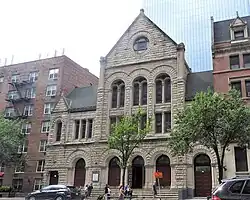 O'Connor was contracted to design a new structure which incorporated the original tower and acquired a new Indiana bluff limestone facade on 32nd Street. Other details include a roof elevated six feet (two metres) higher than the original church, a vaulted ceiling, aisles with groined arches, fourteen Munich stained glass windows, and a gallery in the form of a choir loft with a new 1893 Odell organ at the rear of the church.[3] The blessing Mass was scheduled for Sunday, January 28, 1894. The total dimensions were 75 feet (23 m) wide by 200 feet (61 m) long. In 1892, the address was listed at 408 West 32nd Street.[4]