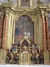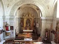 The church's walls are 2 metres (6.6 ft) thick, and it can hold 2,000 people. The baroque murals were created by an unknown painter. The High Altar shows the Legend of St. Stephen Harding. The Trinity is depicted above the mural.
