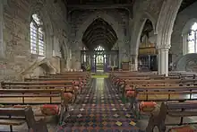 The oak rood screen between nave and chancel is 15th-century, and has perpendicular tracery; there are 17th-century wooden doors in the screen. The chancel and sanctuary are 55 feet (17 m) long. Behind the choir stalls are 14th-century misericords, carved with foliage and figure heads.[1][4]