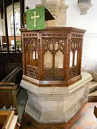 The sedilia in the chancel are believed to be 19th-century apart from the 15th-century moulded jambs. The stalls or pews inside the east side of the rood screen – three on either side of the opening – have shaped and moulded divisions and curved and moulded cappings. It is believed that these seats were brought to the church from another site. It is known that they were re-positioned during the 1880 restoration from the south wall of the chancel. They may well have been for the six priests known to be in the village in 1490.[4] The carvings on the seats on the north side are: modern; a mitred ecclesiastic; a collared animal; a bird with long wings and turned-back head. On the south side: an angel; a winged beast; an animal (mutilated); a defaced head. The two seats either side of the entry have misericords carved, with on the north side a crouching man and a demon's head, while on the south side an ape and grapes in vine leaves. With the exception of the first these carvings possibly date to about 1442.[1][2]