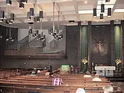 The current church was designed by Belfatto & Pavarini and built in 1965–1967 for $1,200,000[2] ($10,500,000 in current dollar terms), on the same site as the previous church. The seating is distributed closely around the main altar, supporting the liturgical reforms of Vatican II. The stained glass windows incorporate a Madonna and Child rescued from the fire.[3] A new, three-manual pipe organ was built by the Delaware Organ Company.[4] In 2000, the AIA Guide to New York City called this church: "the most positive modernist religious statement on Manhattan Island to date."[5]