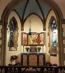 The high altar is made of Caen stone and was installed in 1905.[14] In 1929 the artist and parishioner George Fort Gibbs created seven paintings for the high altar's reredos as a memorial to his parents. The center panel is a Virgin and Child flanked by panels depicting other figures from the Christian era and Old Testament: Saint Francis of Assisi, Saint Peter, King Saint Edward the Confessor (last king of the English House of Wessex), Moses, Aaron, and King David.[13]