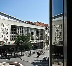 The main stage and exhibition hall occupies the entity of the space, with the L-shaped foyer opening to the square and road.[2] The ceilings of the exterior spaces, tribune and balconies are covered stucco with circular, copper lamps.[2] Over the lateral doors that access the theatre balconies are ceramic elements in the forms of polychromatic wings, in bass relief with birds and flowers.[2]