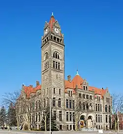 The Bay City Hall is a Richardsonian Romanesque building constructed of Indiana limestone, sandstone, and granite, measuring approximately 120 feet by 200 feet. The multi-gabled roof is tiled, and a large sandstone tower, nearly 180 feet high, is located at the southeast corner. The tower is topped with a gable roof with spires, and contains a large clock with separate dial faces on each of its four sides. The windows in the building are flat-headed units set in round arches, and are divided by heavy stone mullions. The entrance is through a huge double Romanesque arch, decorated with an elaborate stucco bas-relief, and sheltered with an arched porch supported by polished stone columns.[2]