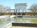 The arch is flanked to either side by curved stone colonnades of three bays, about 6 m (20 ft) high and 26 m (85 ft) long, with a frieze, cornice and low parapet, with wrought iron railings between the stone columns. The walls on either side extend the overall length to over 70 m (230 ft). As originally built, steps aligned with the central arch led down to the west bank of the River Trent, but the steps were moved after the Second World War. The central arch is still aligned with an ornamental pond in the memorial gardens to the west.