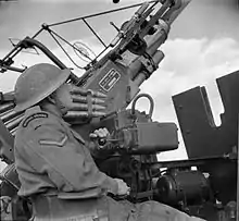 The TA's AA units were mobilised on 23 September 1938 during the Munich Crisis, with units manning their emergency positions within 24 hours, even though many did not yet have their full complement of men or equipment. The emergency lasted three weeks, and they were stood down on 13 October.[84] In February 1939 the existing AA defences came under the control of a new Anti-Aircraft Command. In June, as the international situation worsened, a partial mobilisation of the TA was begun in a process known as 'couverture', whereby each AA unit did a month's tour of duty in rotation to man selected AA sites. On 24 August, ahead of the declaration of war, Anti-Aircraft Command was fully mobilised at its war stations, with LAA units distributed to defend Vulnerable Points (VPs) such as factories and airfields.[85]