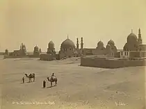Despite this, the necropolises received renewed attention in the 19th century and onward. The family of Muhammad Ali himself were buried in a lavish mausoleum known as the Hosh el-Pasha, built around 1854 near the Mausoleum of Imam al-Shafi'i.[7] Perhaps following this example, many elites, royal officials, and members of the bourgeoisie began to once again build ornate mausoleums and funerary compounds in the Qarafa cemeteries.[1] These new establishments, like the old Mamluk ones, included various services which required the constant presence of workers and, by extension, the provision of housing for them. As a result, the cemeteries began to be repopulated in the 19th century, despite the authorities' changing attitudes to urban planning.[1]