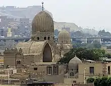 The Qarafa received new attention under the Ayyubid dynasty (established by Salah ad-Din after the Fatimid Caliphate was abolished in 1171), who repaired some monuments and aqueducts and re-initiated urbanization in parts of the cemeteries (despite also destroying Fatimid monuments).[1] Most significantly, Salah ad-Din built the first Sunni madrasa in Egypt (to counter Fatimid Shi'a influence), based on the Shafi'i madhhab, right next to the tomb of Imam al-Shafi'i, while in 1211 Sultan al-Malik al-Kamil built the mausoleum and enormous dome over al-Shafi'i's tomb which remains one of the most impressive in Cairo to this day.[1][7]