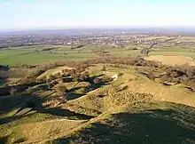 The Westmeston Down rises from Westmeston Farm. Two bostals, Westmeston and Middleton (TQ 343 130), meet at the top (TQ 338 130), between Western Brow and Home Brow. The two paths divide a large cluster of round barrows, (TQ 339 128), which are easier to make out on the western side than the eastern side.[17] In Spring, the Westmeston bostal is rich with wildflower and harbours a huge old ash pollard (TQ 340 130), which many seek out to admire. There are old limekilns in Westmeston chalk pit and the chalk pit south of The Gote, (TQ 348 132).[8] The slopes have well-formed terracettes, ridges, formed by centuries of grazing by sheep.