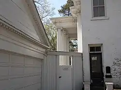 The two show fronts are five bays wide. The garden front on the south has a pedimented tetrastyle portico. The wall brackets on the cornice continue onto the portico. The columns that hold up the portico follow the Renaissance Ionic order after Vincenzo Scamozzi.[3] The columns rest on paneled pedestals. Between them is a cast concrete balustrade that was extended in the early 20th-century in a semi-circular fashion beyond the portico. The north front of the house has a one-story porch that covers the middle three bays. At one time it stretched the entire length of the house.[3]