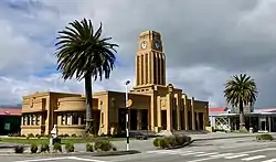 Archibald Macdonald, a local architect in Westport, was engaged for the design of the municipal chambers. Macdonald chose the Moderne architecture style for his design.[2] The construction contract was tendered in August 1938[5] but as the tender prices were considered too high, the building was constructed using day labour instead.[6] By December 1938, the previous council offices on the corner of Palmerston and Lyndhurst streets had been demolished and the site cleared for foundation work. The new council chambers were built in reinforced concrete, with interior work in rimu and terrazzo floors. Rising construction costs caused by the outbreak of World War II caused delays and financial problems. The building was complete, apart from the upper part of the clock tower, by April 1940. The finishing touches were done during 1941. The former proprietor of the local cinema, Harry Morgan, donated the clock. The building is coated in Motueka sand, which gives it a distinctive mustard colour. There were plans to add a town hall behind the building and for that reason there was never an official opening party held. The building cost NZ£18,423 and the donated clock was worth NZ£1,250.[2][5]