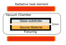 It is a type of physical vapor deposition where the substrate to be coated and the source material are held close to one another. They are both placed in a vacuum chamber, which is pumped down. The source and substrate are then heated. The source is heated to some fraction of its melting temperature, and the substrate some lower temperature e.g. 640 °C and 600 °C, respectively.[2] This causes sublimation of the source, allowing vapors to travel a short distance to the substrate, where they condense, producing a thin film. This short-path diffusion is similar in principle to short-path distillation. Compared to other techniques, it is a relevantly insensitive process, and takes as little as 15 minutes for an entire cycle.[3] This makes it a very viable technique for large-scale manufacturing.[4]