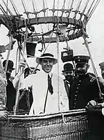On 1 November 1908, a meeting was organised, and therefore the club was named "Club Atlético Huracán", according to club's certificates, signed by José Laguna as the first president of the institution. In that meeting the white color with a balloon emblem on the chest, was also established as club's jersey.[1] This was established as the official foundation of Huracán. Likewise, the balloon emblem was a homage to Argentine aviation-pioneer Jorge Newbery's, which had been brought from France and first piloted by Newbery in 1909. The club asked Newbery for permission to use the balloon, which Newbery replied saying "I gave my most complete approval to the request, hoping that the team will honor the balloon that crossed three countries (Argentina, Uruguay and Brazil) in a unique trip". When Huracán reached the first division, the managers sent a letter to Jorge Newbery that said: "Huracán has kept its promise, promoting three divisions, as your balloon crossed three republiques before, so your wish was accomplished" [2]