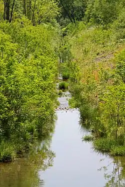 Much of the flow of Coal Creek is diverted around a levee at one point. Some of the creek's flow also goes through storm sewers.[4]