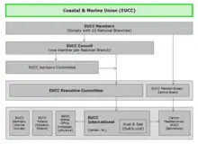 The Coastal and Marine Union (EUCC) is an association with a membership of around 500 institutions, NGOs and experts in 40 countries, organised in national branches. The organisation is headed by an international Council that is composed of one representative per national branch. A number of Council members are assigned as members of the Executive Committee.