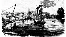 Further upstream from the Dyke, on the South Channel of the Hunter River, were some privately operated chutes capable of another 3,000 tons per day.[101] These private operations dated back to those of the Waratah Coal Company, which opened its own 600 foot long wharf on Bullock Island, in March 1865. The wharf was connected first to the company's mine at Waratah and later to another of its mines at Charlestown. It was this venture, and the small township that sprang up near the wharf, which gave the northern part of the port area its name, Port Waratah. The port facility and railway line were bought by the Caledonian Coal Co., who used it until 1904, when the river had become too shallow due to silting.[105]