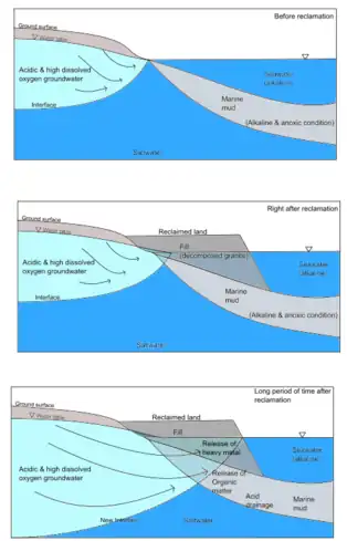 The groundwater discharge after reclamation decreases as the fill increases subsurface flow path length. As a result, the water level elevation in the upstream or attitude would rise. Rainfall recharges the new land and increases the storage capacity of the land. Increasing the water level and seaward groundwater discharge and shifting the water divide in the future.[5] Lengthening of the groundwater flow paths can dissolve the pollutants inside the marine mud and bring the pollutants to the ocean.[6]