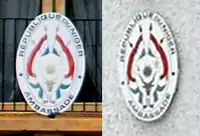 The coat of arms of Niger shows a trophy of four national flags, in the colors orange, white, and green. In the middle, the state seal is arranged. On a green or gold shield the four golden symbols are shown. In the middle, there is a sun, to the left there is a vertical spear with two crossed Tuareg swords, to the right are three pearl millet heads and underneath is the frontal view of a zebu head. Under the coat of arms, there is a ribbon bearing the name of the country in French: Republique du Niger. While the constitution of Niger stipulates the color of the symbols upon the shield, there is no uniformity on the color of the shield. The 1999 Constitution reproduces the text of earlier constitutions, making a distinction between the Seal of State (Le Sceau de l'État) for which no shield colour is stipulated and the Coat of Arms of the Republic (Les Armoiries de la République) for which Sinople is stipulated as the shield colour.[1] Sinople is analogous to Vert (Green) in heraldry, but official buildings and documents do not display green shields. Embassies and official documents use white, with gold emblems. The website of the President of Niger uses gold or yellow with dark gold or black emblems. The National Assembly of Niger meets below a large coat of arms with the shield coloured gold and the emblems in a darker gold.[2][3]