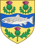The 1867–1929 shield was blazoned Or, on a fess wavy azure between three thistles proper a salmon naiant argent.[5]