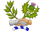 - Two hands, one naked and the other clad in armour, holding a thistle, representing Scotland, and laurel, representing peace.[3]