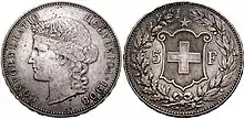 In the 1850 series of the Swiss franc coins, the small denominations (1, 2, 5, 10 and 20 centimes) had a coat of arms with floral ornaments, while the larger denominations (½, 1, 2 and 5 francs) showed a seated Helvetia figure holding a triangular shield on which the Swiss cross was displayed within an oval shape. The coat of arms in the denominations 5, 10 and 20 centimes was replaced by a female head (Liberty) in 1881. In the 1 and 2 centimes coins, the coat of arms was replaced by a simple Swiss cross in 1948. For the ½, 1, and 2 francs coins, the seated Helvetia was replaced by her standing figure in 1875. The 1888 five franks coin showed a coat of arms with a heraldic shield in a shape inspired by Baroque cartouche designs. The 1922 design of the five franks coin introduced a simplified shield of the rounded "Iberian" type.
