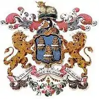 The Worshipful Company of Drapers, informally known as the Drapers' Company and formally known as The Master and Wardens and Brethren and Sisters of the Guild or Fraternity of the Blessed Mary the Virgin of the Mystery of Drapers of the City of London, was probably the first corporate body in England to be granted a coat of arms, on 10 March 1438/9[2] by Sir William Bruges, Garter King of Arms.[1] The patent dated 1439 is the earliest surviving such grant of arms made to a corporate body in England.[3] The arms were modified in 1561, when the crest was added and the lion supporters granted. These grants were superseded in 1613 with minor modifications. The Queen as Freeman of the Fraternity possesses a small jewelled and enamelled brooch depicting its arms and circumscribed by the motto, known as "The Drapers Company Badge". She wears the brooch when performing royal engagements connected with the Drapers Company.[4] The modern blazon is: Azure, three clouds radiated proper each adorned with a triple crown or.[1] The triple crown contains a cap (velvet/fabric lining visible through the gold structure) gules.