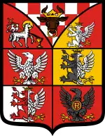 The design of the coat of arms had originated from the seal used by Siemowit III, Duke of Masovia, in 14th century, that depicted an eagle with raised wings, and its head facing left. From 1370 to 1381, duke Siemowit III was a sole ruler of the Duchy of Masovia.[4] In 1381, the state had been partitioned by the sons of Siemowit III.[5] In such division, the areas under the control of duke Siemowit IV, the duchies of Płock, and Rawa, continued using the design of the seal of their father, as a coat of arms with white (silver) eagle on a red background.[6] At the same time, Janusz I of Warsaw, duke of the Duchy of Warsaw, begun using the coat of arms divided into 4 equal fields, with top left and bottom right fields were white, with a red dragon on them, while top right and bottom left fields were white with a red eagle on them.[7] The design of the coat of arms with a white (silver) eagle on a red background continued being used as a symbol Masovian duchies until 1526, when the area was incorporated into the Crown of the Kingdom of Poland, where it was rearranged into the Masovian Voivodeship.[8] The voivodeship continued using the similar design of the coat of arms, until 1795, when it ceased to exist in the Third Partition of Poland.[3][9][10]