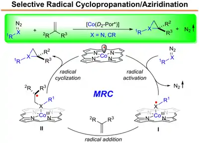 - ↑ Dzik, Wojciech I.; Xu, Xue; Zhang, X. Peter; Reek, Joost N. H.; de Bruin, Bas (2010-08-11). "'Carbene Radicals' in CoII(por)-Catalyzed Olefin Cyclopropanation". Journal of the American Chemical Society. 132 (31): 10891–10902. doi:10.1021/ja103768r. ISSN 0002-7863. PMID 20681723.
