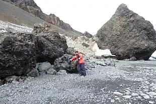 Geologically, the area makes up the Cockburn Island Formation, which was studied extensively in the late 1990s by H. A. Jonkers.[1] Rocks found on the island are volcanic,[2] and the island is characterized by its "precipitous cliffs".[3] A "Pecten conglomerate" from the late Pliocene or early Pleistocene period has been identified on the island, situated on a wave-cut platform at 720–820 ft.[4] The island is a rare volcano type called a tuya, or moberg, which was formed by a three-stage eruption sequence below an ice cap. The first stage was a subglacial hyaloclastic eruption under a thick ice cap, which shattered the lava into glass, ash and sand, which has since weathered to yellow palagonite layers. The second phase was a lava eruption into a meltwater glacial lake contained in the ice cap, which resulted in volcanic breccia and basalt pillow lava (boulders of this can be seen along the shore). The final phase was subaerial basalt lava flows on top of the previous volcanic deposits after the lake drained or boiled away.