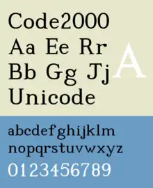 Code2000 is a serif and pan-Unicode digital font, which includes characters and symbols from a very large range of writing systems. As of the current final version 1.171 released in 2008, Code2000 is designed and implemented by James Kass to include as much of the Unicode 5.2 standard as practical (whereas 12.0 is the currently-released version), and to support OpenType digital typography features. Code2000 supports the Basic Multilingual Plane. Code2001 was a designed to support the Supplementary Multilingual Plane, with ISO 8859-1 characters shared with Code2000 for compatibility. A third font, Code2002, was left substantially unfinished and never officially released.