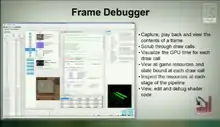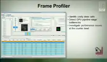 GPU PerfStudio is AMD's performance and debugging tool for graphics applications. It was initially developed to support Direct3D and OpenGL on Microsoft Windows only and was ported to Linux during 2013 and is available for Linux since the end of Q1 2014. The suite of tools is considered useful when developing games for Steam Linux and especially useful when optimizing games for AMD GPUs. GPU PerfStudio has an integrated Frame Profiles, Frame Debugger and API Trace with CPU timing information.