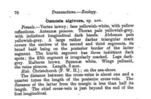 Thorax pale yellowish-grey, with indistinct longitudinal dark bands. Abdomen pale yellowish-grey. A large rather darker triangular mark covers the centres of the second and third segments, its broad base being on the posterior border of the latter segment. The fourth segment has three indistinct dark spots; the fifth segment is irregularly marked. Legs dark-grey. Halteres brown.