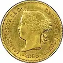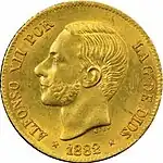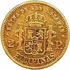 1 peso | 15 mm | 1.69 g | 87.5% gold | Reeded | Queen Isabela II or King Alfonso XII |